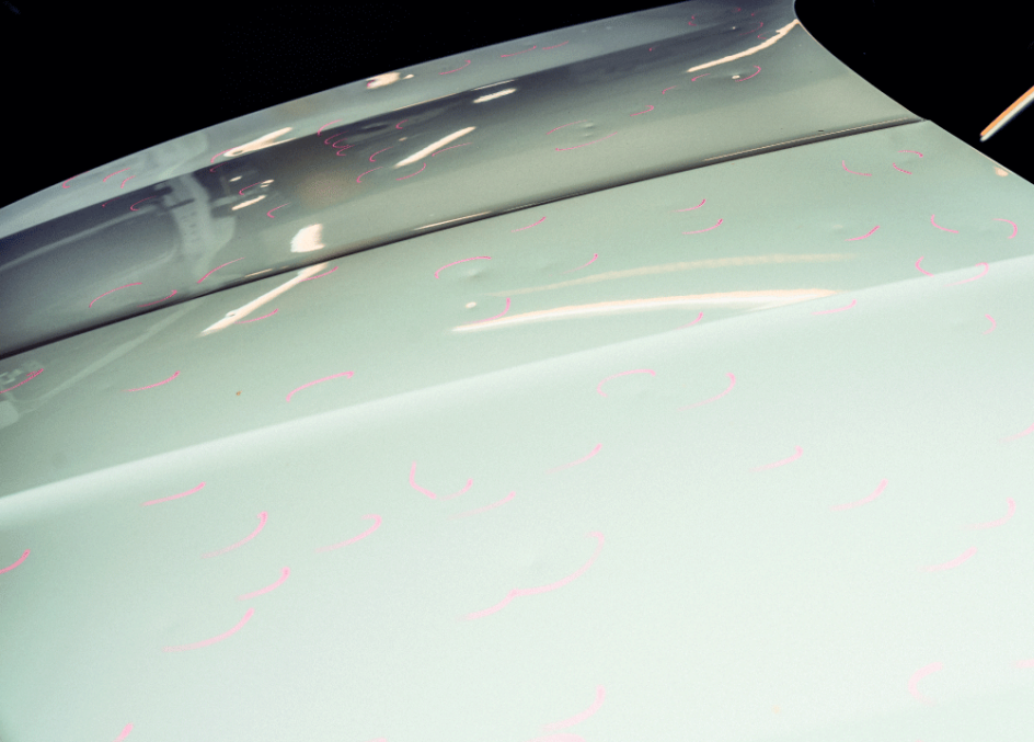 Auf der Motorhaube sind Dellen eines großen Hagelschadens. Zur Sichtbarkeit und Zählung wurde diesen mit Hilfe eines speziellen Stifts angezeichnet.